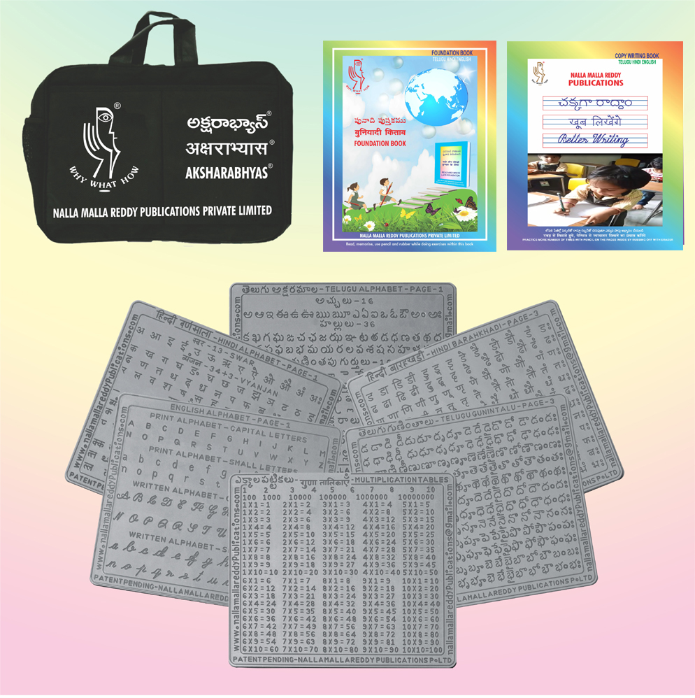 After learning to read and write the letters perfectly, A book to read by name “Punadipustakam, Bunyadikitab, Foundation book” in 3 languages Telugu, Hindi and English with basic worldly knowledge and a Copy Writing Book in 3 languages to practice writing on paper with pencil, with six(6) slates with letters in grooves, “Aksharabhyas” Kit is unveiled.