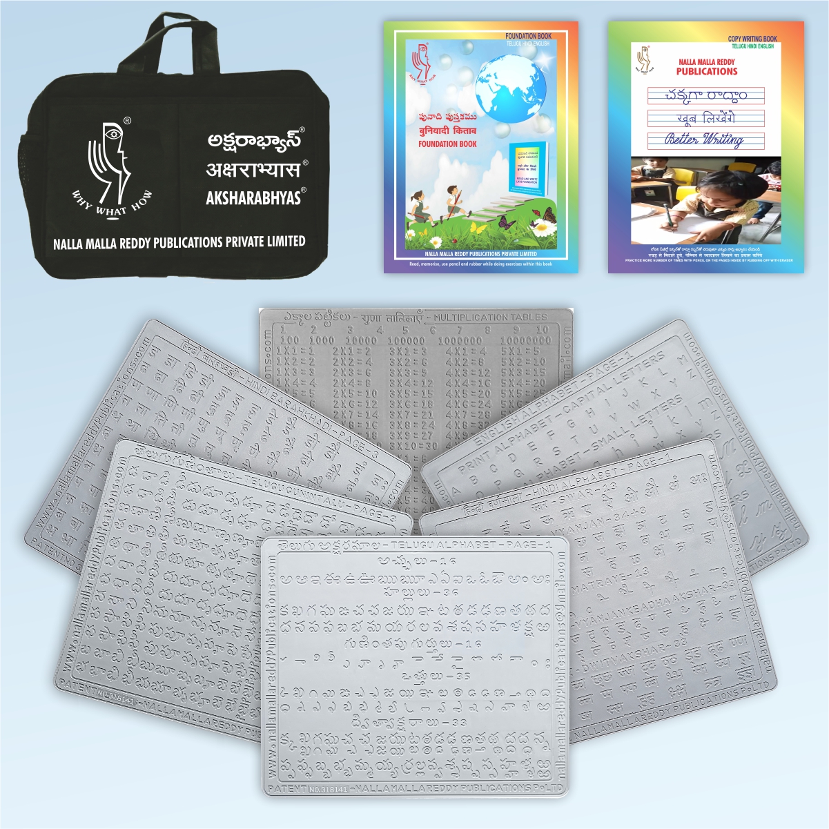 First Part contains 3 slates with 1 and 2 pages of letters in grooves in Telugu, Hindi and English; Second Part contains 3 slates out of which 2 slates with 3 & 4 pages in Telugu and Hindi and one slate of Multiplication Tables with 1 & 2 pages and the Third Part contains “Punadipustakam, Bunyadikitab, Foundation book” and a Copy Writing Book to practice on paper with pencil, both in three languages, making the children self-confident with perfection in reading and writing of languages, who excel in future without worry to the parents.